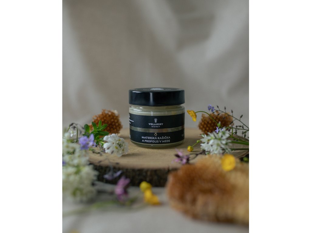 Materská kašička a propolis v mede (250 g) – lahodný kvetový med obohatený o materskú kašičku a propolis, ktorý dodáva energiu, posilňuje imunitu a má prirodzené antibakteriálne účinky.