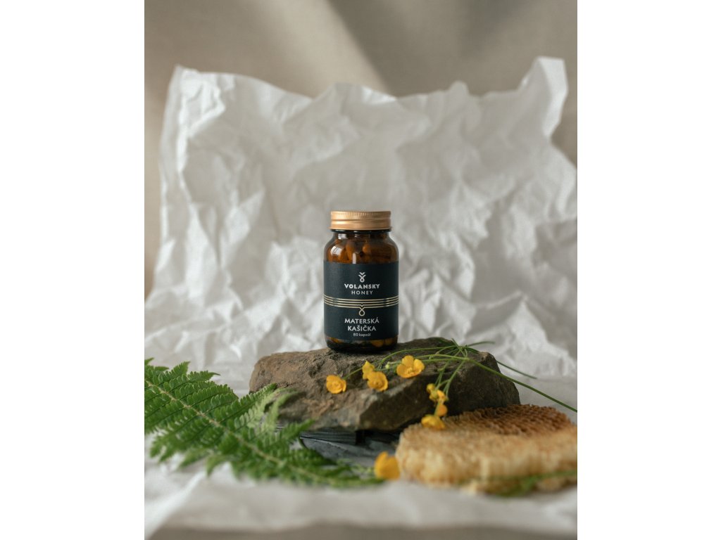 Materská kašička v kapsulách (80 ks) – lyofilizovaná materská kašička bohatá na vitamíny skupiny B, aminokyseliny a bioaktívne látky. Podporuje regeneráciu buniek, hormonálnu rovnováhu, energiu a celkovú vitalitu organizmu.